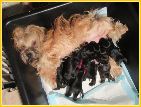 At 2 weeks old, the puppies have started to open their eyes. They are still sleeping all day, until mom comes in to give them a meal. When they are awake they try so hard to stand up and walk as it is a mad dash to get to mommy first, but their legs still aren't strong enough to hold them for very long. They revert back to crawling, because nothing is going to keep them from getting to that delicious momma's milk. That's obvious, as they are all growing very nicely, with more than tripling their birth weight. |