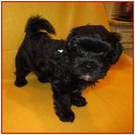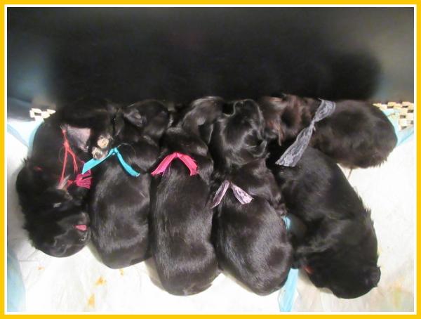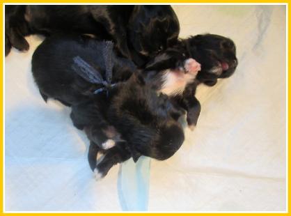 | These puppies have come a long way since the day they were born just 9 short weeks ago. They are very active, playful, and sometimes very noisy. But that's a good thing! Well, not so much late at night, but that comes with the territory. As you can see in the pictures below, they are beautiful with dark wavy coats that is filling in so nicely. They weigh between 3 and 4 pounds now. Earlier in the week they had a new adventure of going outside. I let them run around the yard and explore a bit. To their dismay though, they spent the bulk of their time outside, enjoying the fresh air in a covered ex-pen - safe from any outside dangers. Today the puppies had their 1st car ride as we went to see my Vet. Her office is 50 minutes away It was scary for them, and they expressed their discontent from both ends, by the time we arrived. UGH! Sorry puppies this was so upsetting. Sorry Vet Tech for the cleanup detail. But although this was hard for them, they soon recovered, and were very relaxed while being examined by the vet. With all good reports, we left for home to face another long car ride. Sorry again puppies. As they get out for more car rides, they will get used to it and even start enjoying them, as they realize how much fun it is to go out with the family. Before long, it won't be so scary anymore. Soon they will be going into their permanent homes. They will miss being here with their mommy Kahlua, their siblings, me and even my Golden Retrievers. But their sadness will soon turn to happiness, as they get to know and be loved, by their new family. |