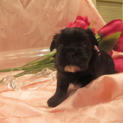 At the 4 week mark, the puppies have achieved several milestones in their growth. They are walking around more now, although they still do stumble and fall over quite frequently. The eyes are fully opened which makes it so much easier to find mom when she comes in their area. They have gotten very verbal. At this age they make a sound which to me sounds like a combination of a bird chirp and cat purring. They have now realized they have other buddies around to play with, and even at this young age, I have to remind them not to play so roughly. As they grow and roughhouse with each other, they will be learning not to play so hard as they teach each other what OUCH means in puppy language. They are having their first tastes of solid food. Not a big fan of it yet, but will slowly get used to it. As they eat more solid food, Kahlua's milk will gradually be decreasing and she will start refusing to let them nurse as frequently. I've opened up their living space and removed their bin as they have been very successful in figuring out how to climb out of it. I placed a potty tray with them so they can start learning about the proper bathroom place to help them understand the outside grassy areas are for potty. |